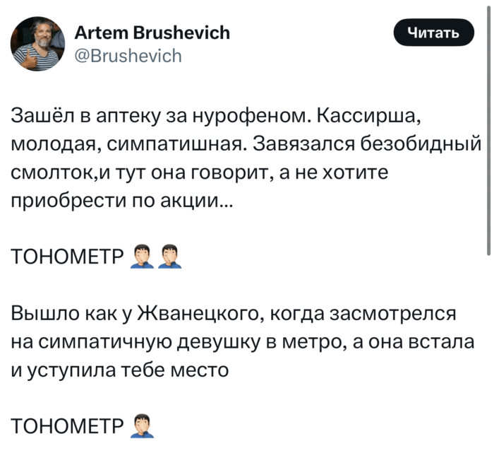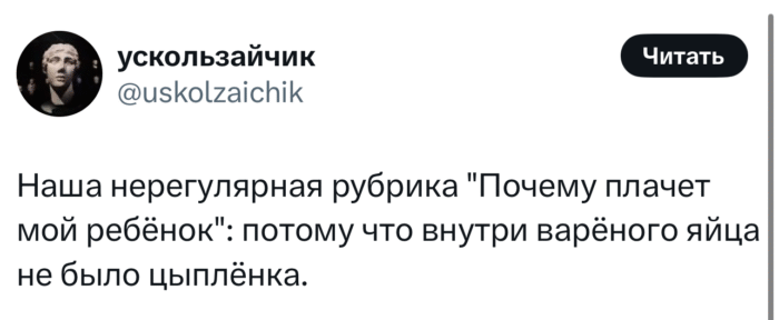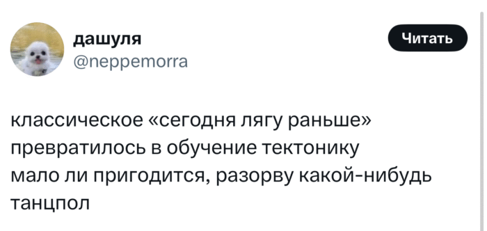 А мы, в редакции, героически выполняем свою социальную миссию: просеиваем тонны цифровой ерунды, чтобы вручить вам на блюдечке самые остроумные, ироничные и узнаваемые твиты пятницы. В этом выпуске: беспонтовый пирожок, обострение самоиронии, обнимашки от интеллекта и щепотка глупости, без которой в наше время просто невозможно.